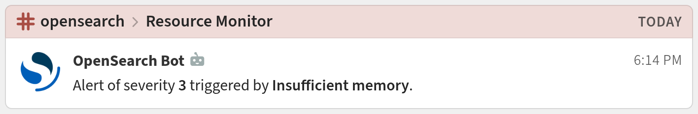 OpenSearch sends notifications as plain text, so you will want to use a Message template to format your messages in Zulip. To generate the topic of your Zulip messages via the notification content, you can use the first line of your template to do so. It must be formatted as topic: DYNAMIC_TOPIC_CONTENT, and all message content should start on the second line of the template. For example, this template was used to generate the example screenshot below: